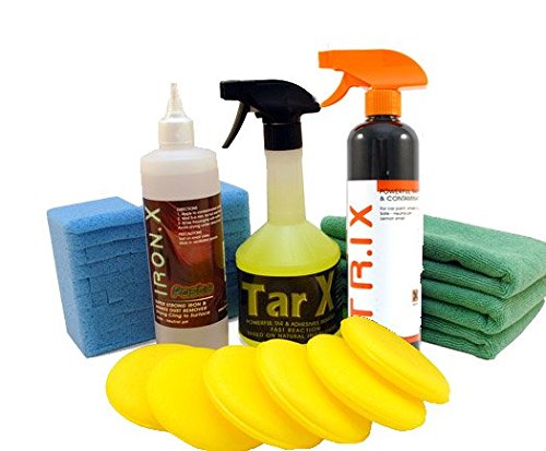 Kit includes: 500 ml. CarPro Iron X Spray, 500 g. CarPro Iron X Paste, 600 ml. CarPro Tar X, Lake Country Foam Car Wash Sponge, 3 Microfiber Detailing Towels (16 x 16 inches), and 6 Poly Foam ApplicatorsIron X by CarPro is an acid-free, pH-balanced iron remover that decontaminates auto paint and wheels. Iron X prevents the spread of iron-related damage to protect your vehicle from paint system failure. Iron X is a clear solution in the bottle but it turns purple when it comes into contact with sintered iron particles.Iron X Paste has a long dwell time to work as long as needed to remove iron and brake dust spots. The paste formula is excellent on vertical panels, wheels, and isolated spots.Tar X safely lifts grease, tar, asphalt, insects, tire marks, adhesives, traffic film, and any other stubborn contaminants. There are no harsh chemical solvents and nothing to harm your vehicle. When Tar X is applied generously, it glows on dark or black cars. The visibility makes it easy to remove all of Tar X when rinsing.To use this kit, start with a clean vehicle. Apply Iron X Spray over the vehicle and wipe it in with a damp sponge. Apply Iron X Paste on vertical surfaces and/or wheels. Wait 5 minutes for Iron X to change color. Wipe it off with a damp sponge and then rinse off the entire vehicle. Dry the vehicle well.Model # CP-300