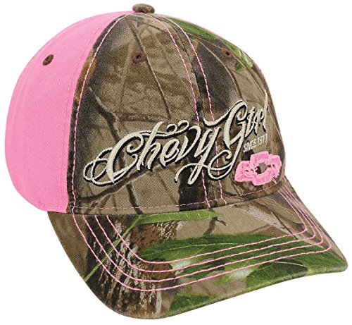 This distressed, low-profile ball cfeatures a distressd bill with embroidered design on the front panel. This pink camo hat features a natural cotton-hued front panel with “CHEVY GIRL SINCE 1911” design on the front. Features: Embroidered “CHEVY GIRL SINCE 1911” emblem Pre-curved visor Adjustable fabric velcro to fit most sizes Official GM Licensed Product